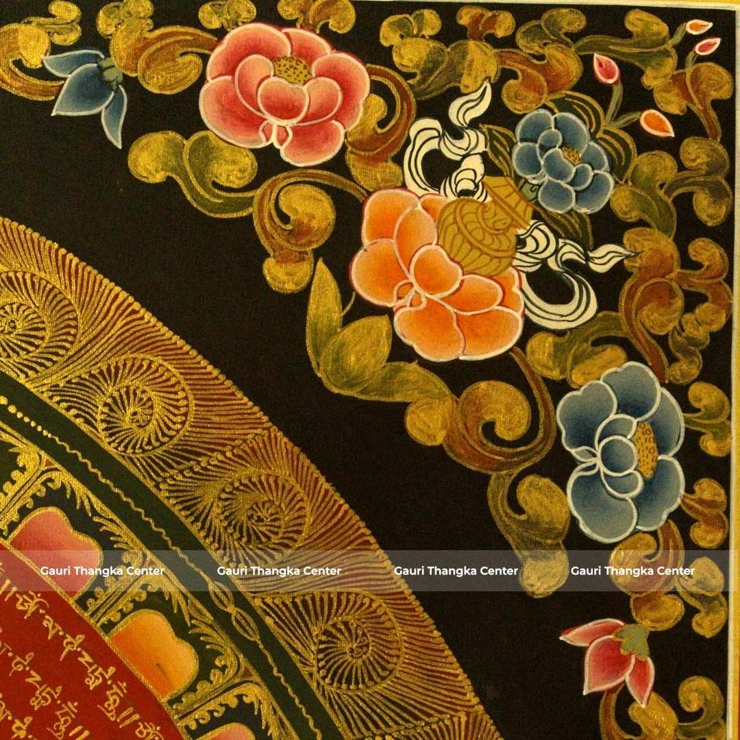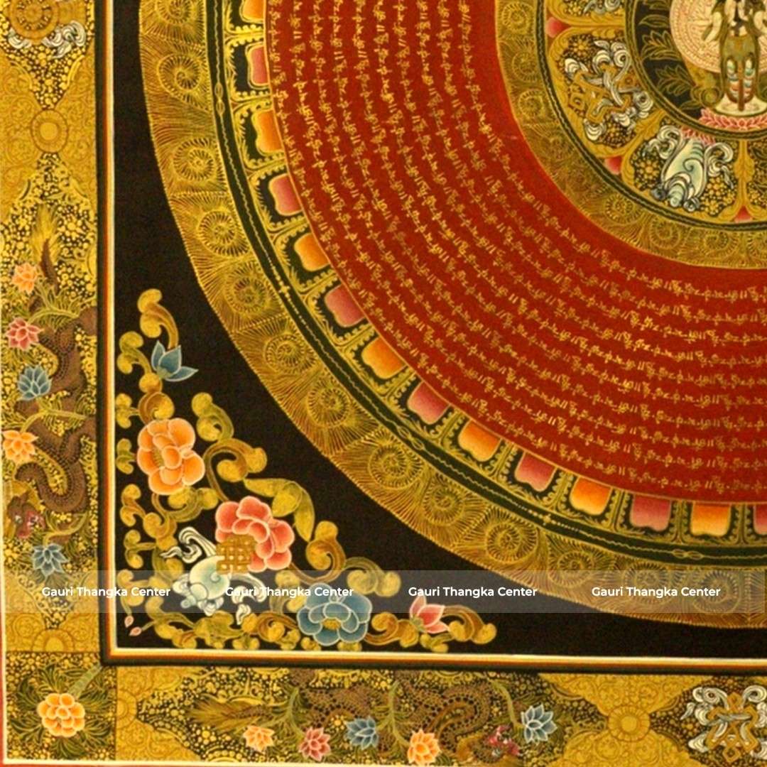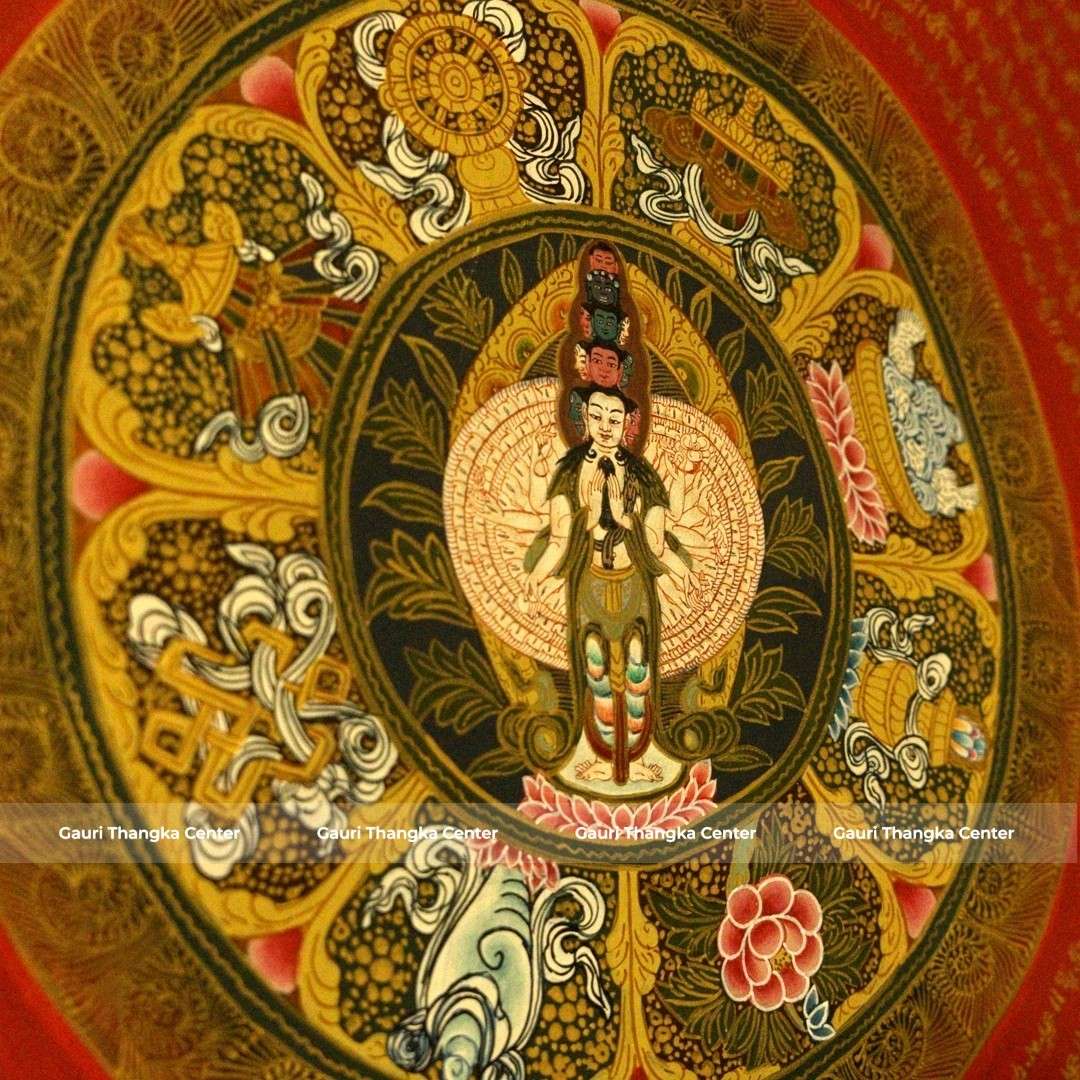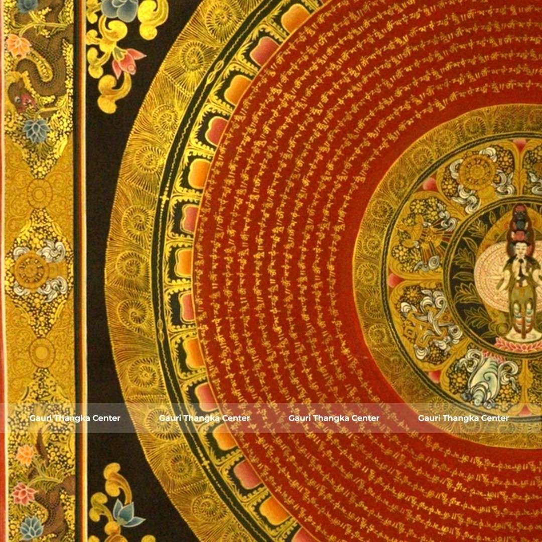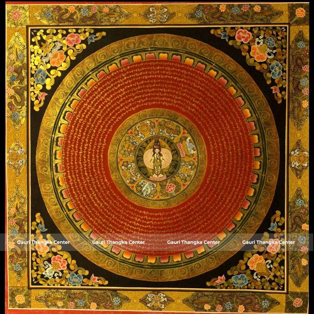 This Thangka features a highly detailed circular mandala with Avalokiteshvara at its center, surrounded by intricate patterns, symbolic elements, and flowing script. The composition reflects precision, symmetry, and deep spiritual meaning, making it both visually captivating and meditative.