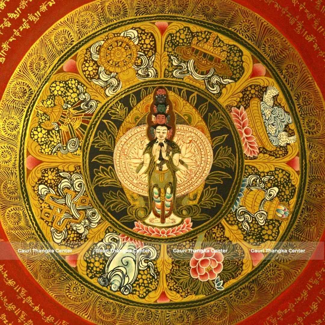 The Avalokiteshvara Mandala represents the sacred universe centered around the Bodhisattva of compassion. It symbolizes balance, harmony, and the path toward spiritual awakening through mindfulness and inner peace.