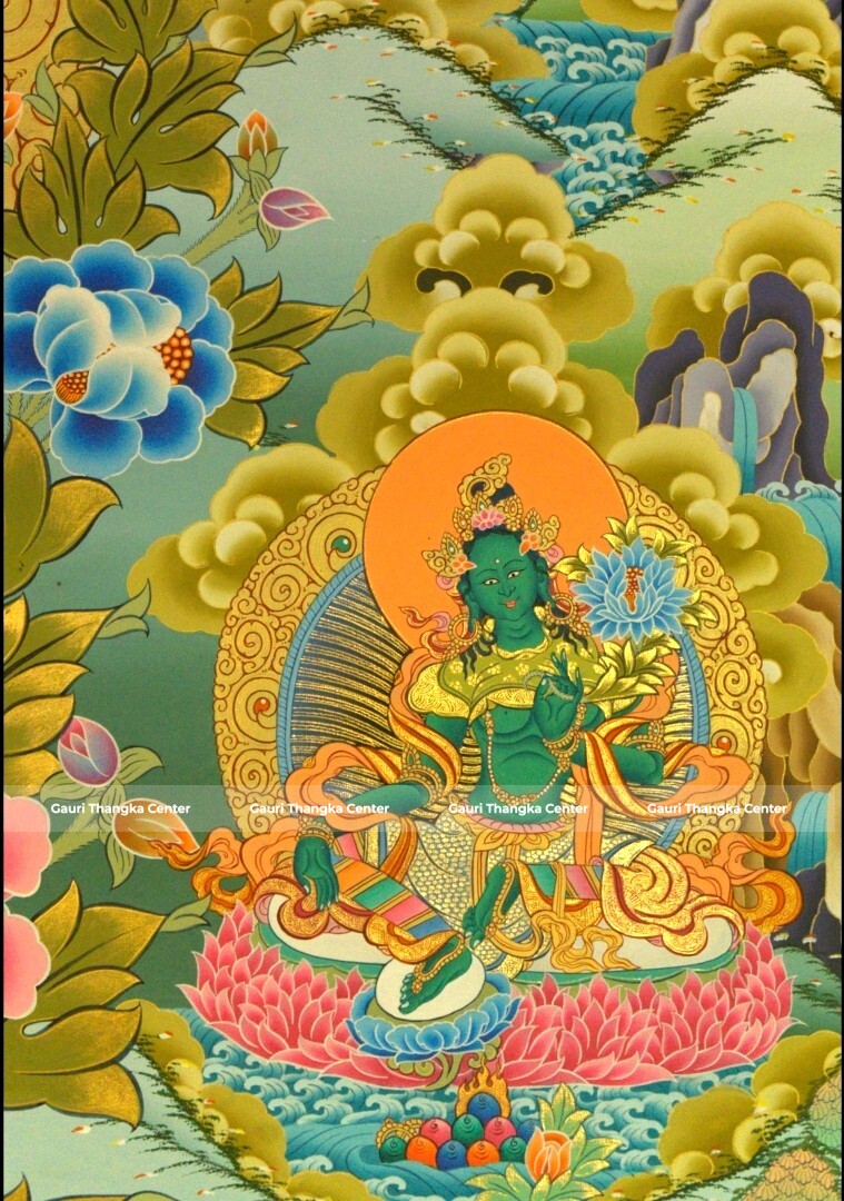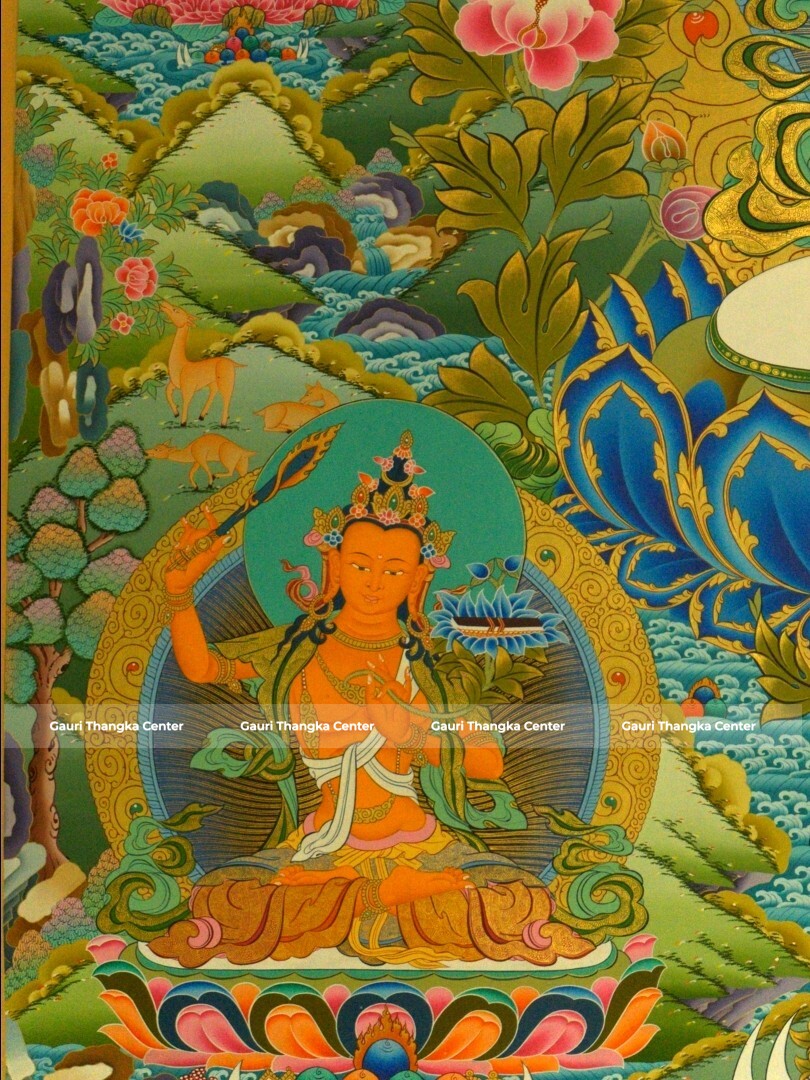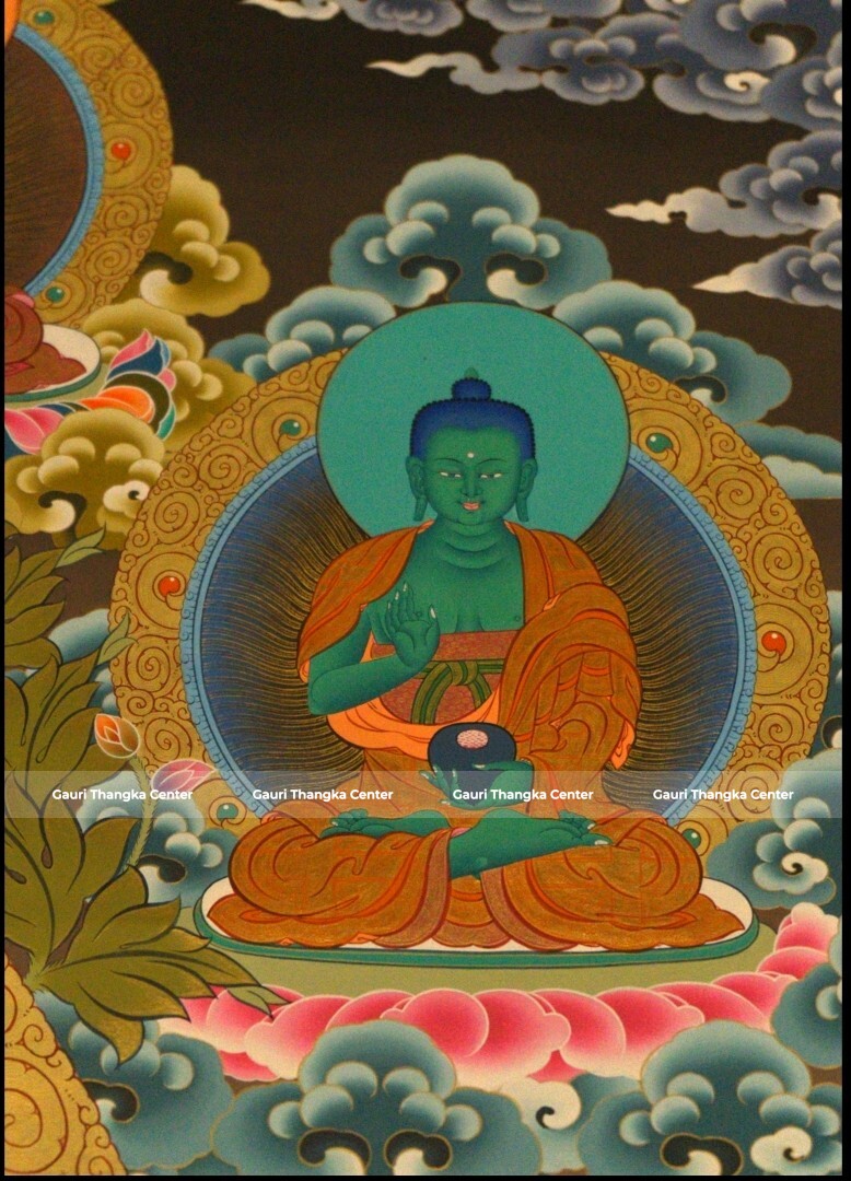 This master quality Thangka showcases Avalokiteshvara in a highly refined composition, surrounded by intricate detailing, celestial elements, and harmonious symbolism. The extensive use of 24K gold, combined with precise brushwork and balanced proportions, elevates this piece to a collector-grade artwork.
