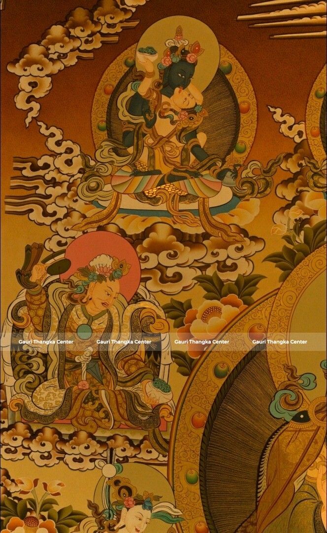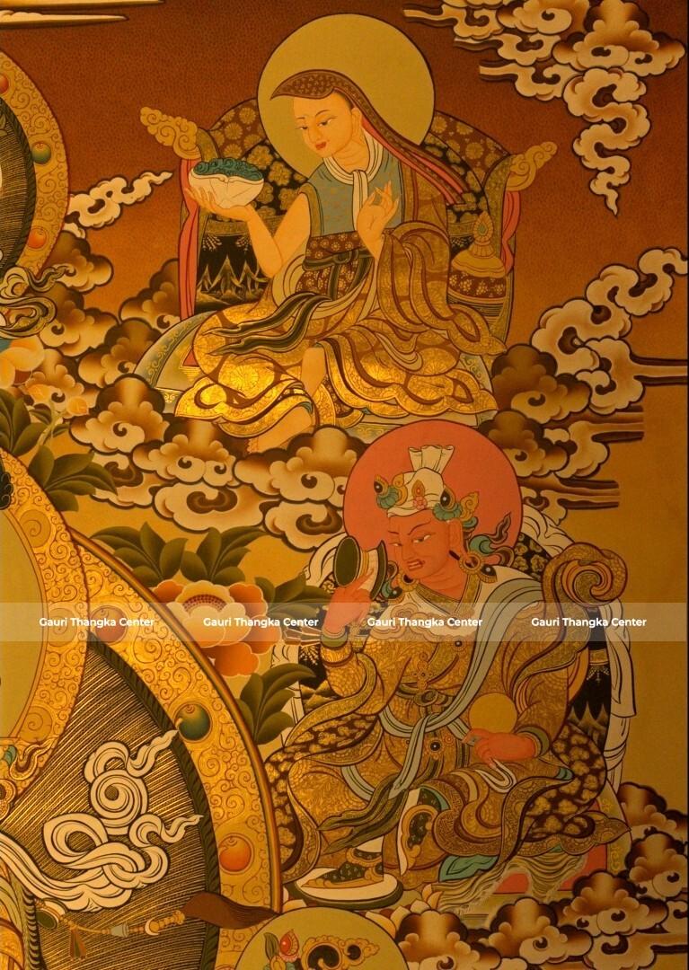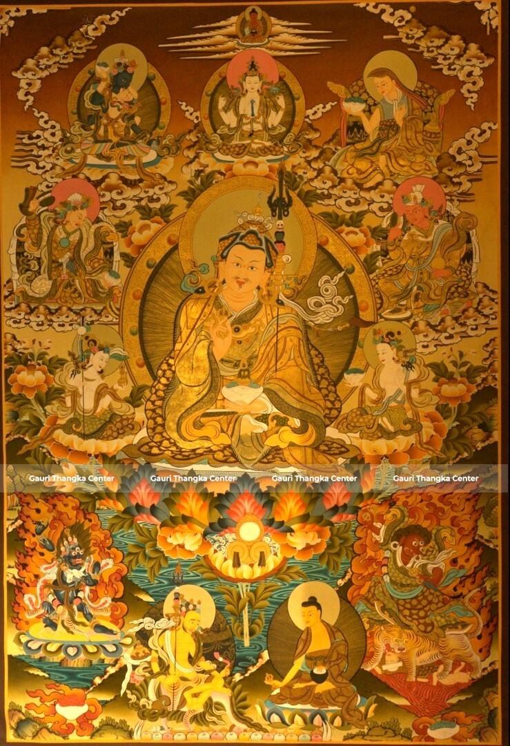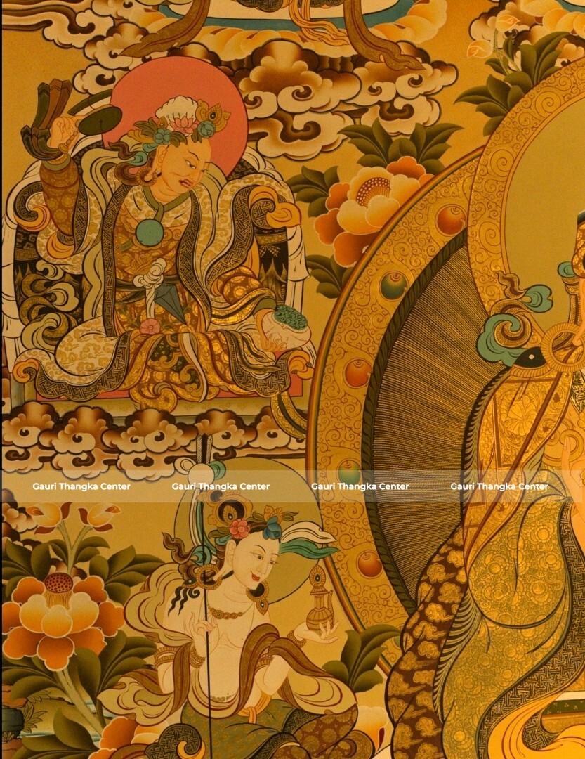 This Thangka portrays Guru Rinpoche in a richly detailed composition, surrounded by various deities and symbolic elements that represent wisdom, protection, and transformation. The 24K gold detailing enhances the intricate artwork, giving it a radiant and sacred presence.