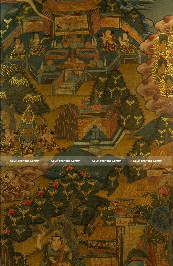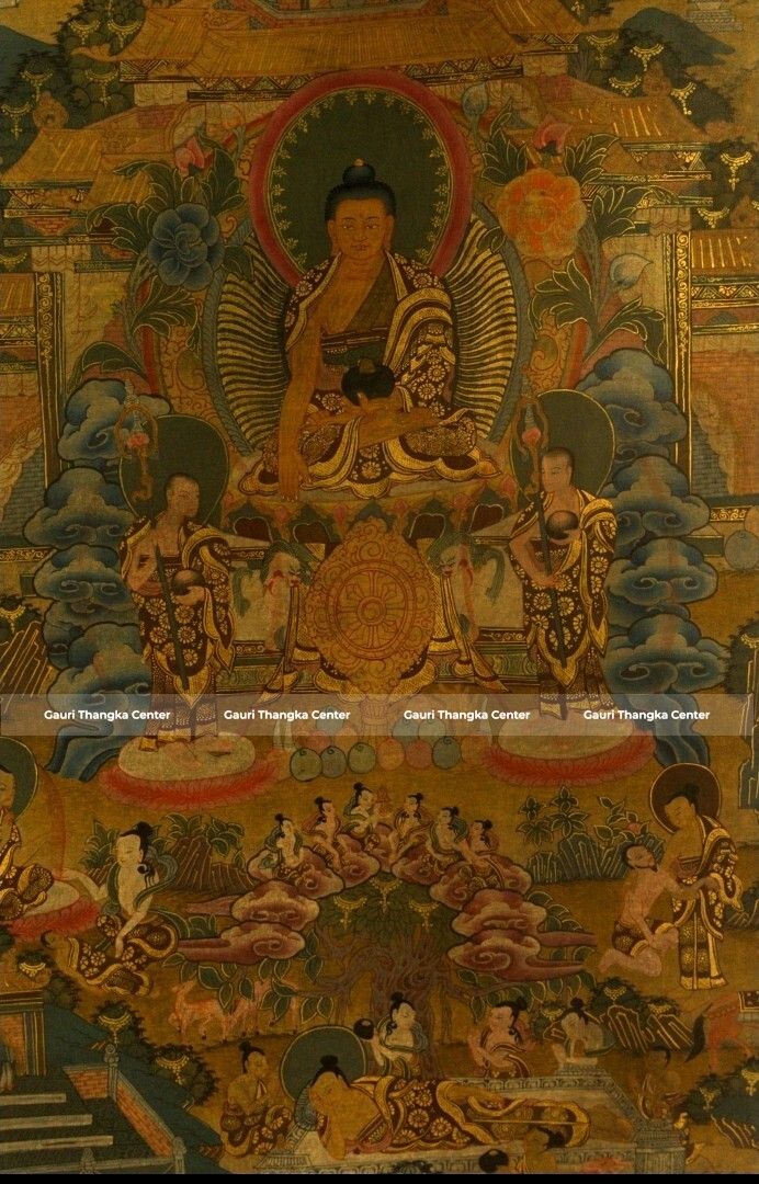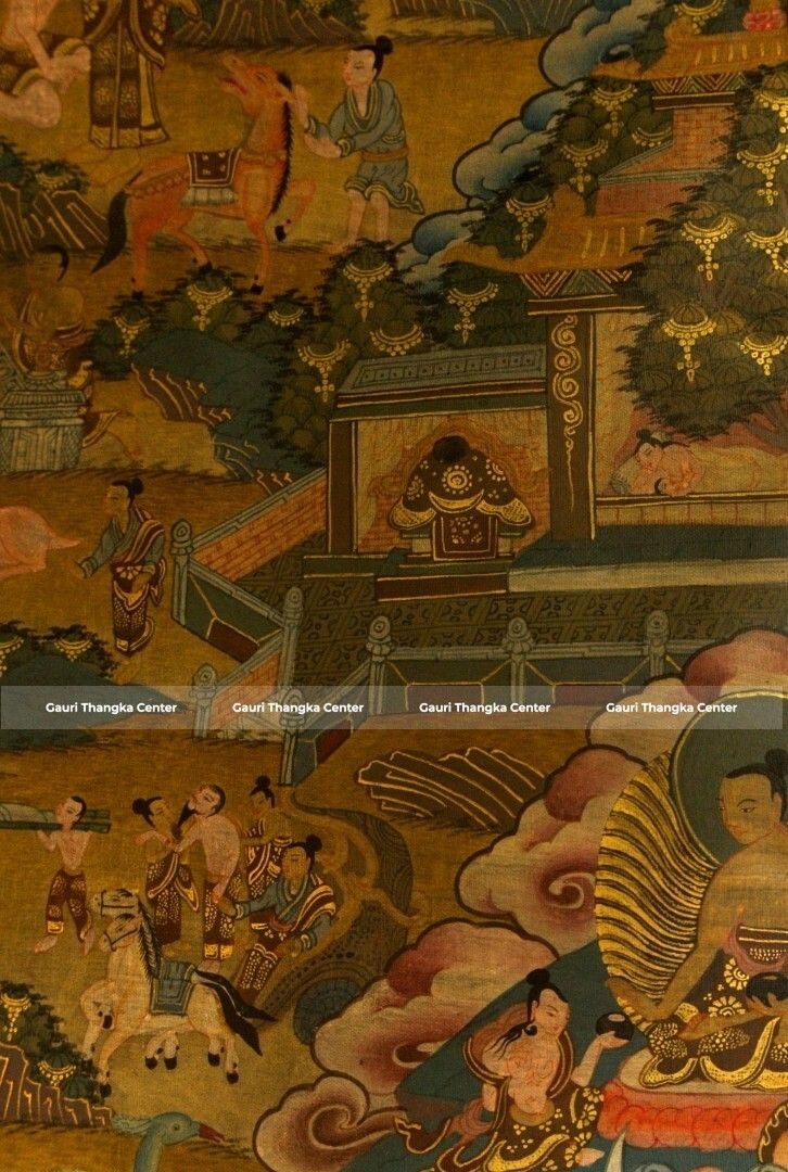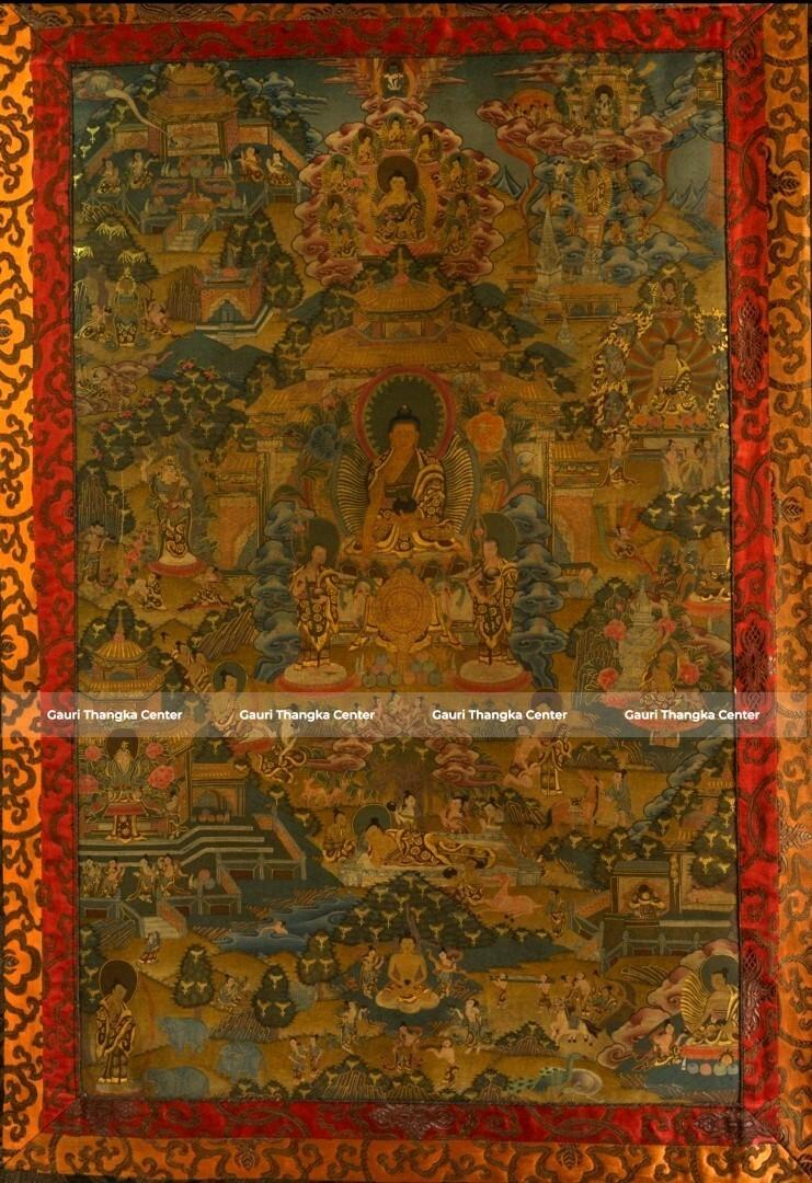 This intricate Thangka presents a detailed composition centered around Shakyamuni Buddha, surrounded by multiple narrative scenes depicting key moments from his life. Each section tells a story—his royal beginnings, spiritual quest, enlightenment under the Bodhi tree, and the spread of Dharma.