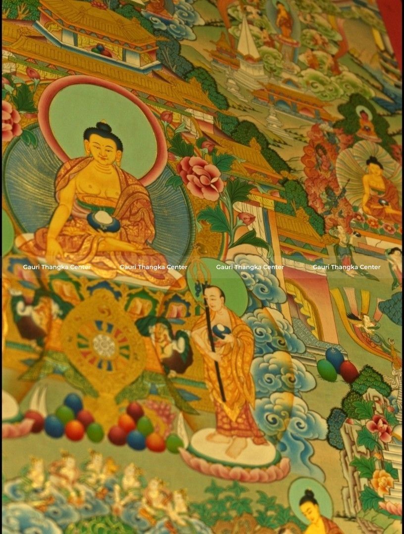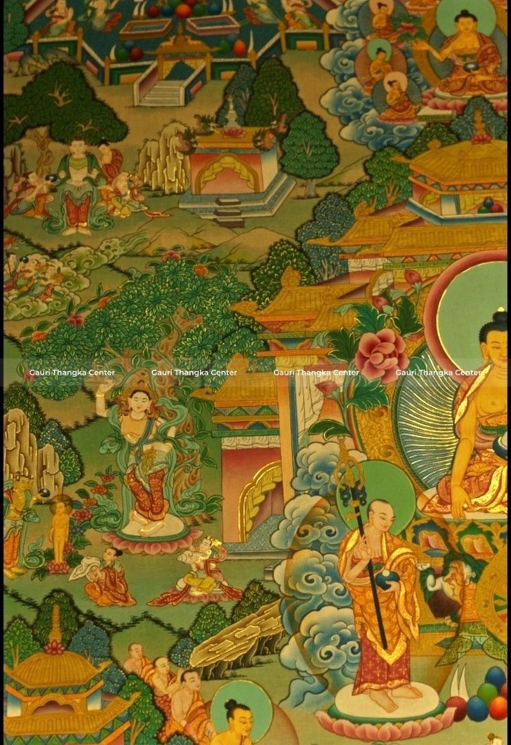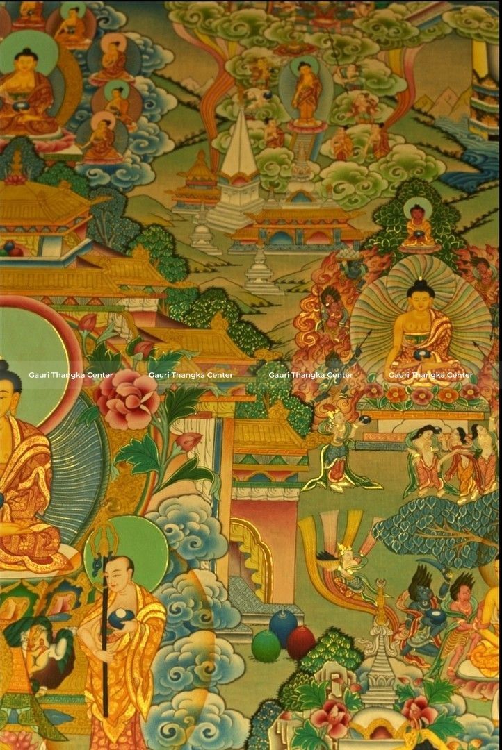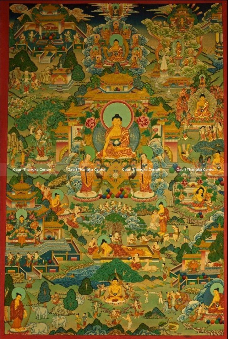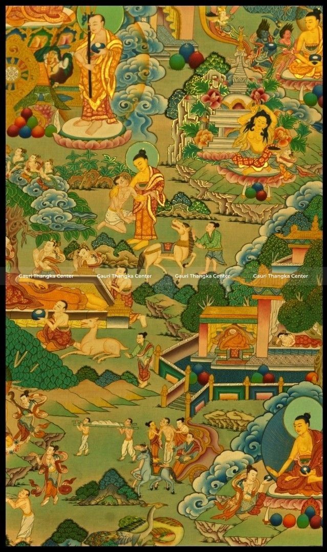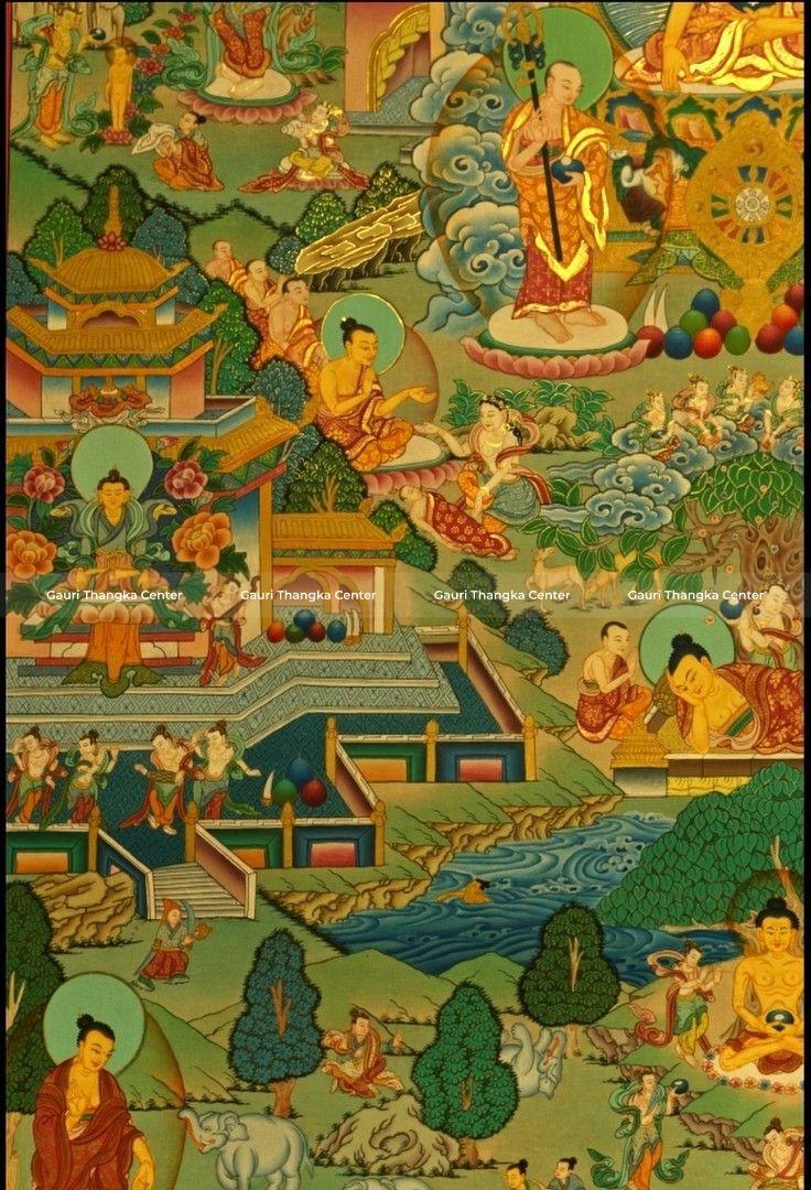 This Thangka illustrates the life journey of Shakyamuni Buddha, depicting key moments from birth to enlightenment and teachings. Each scene reflects wisdom, compassion, and the path to awakening.