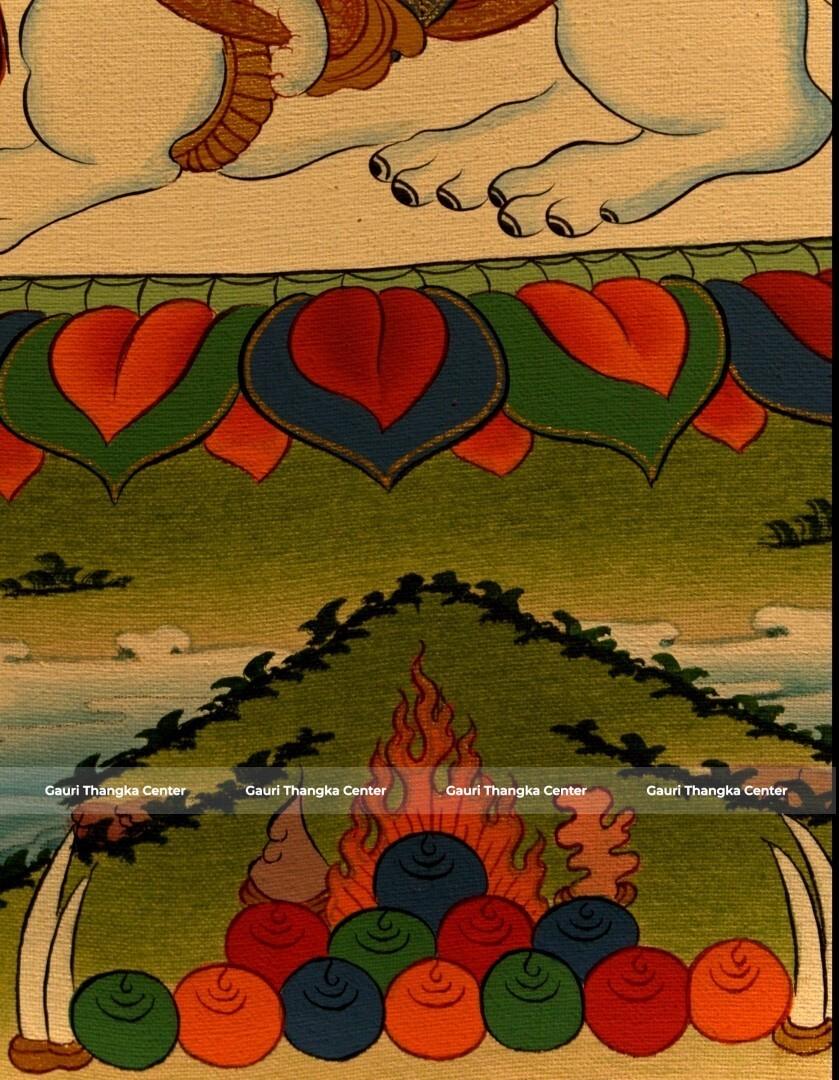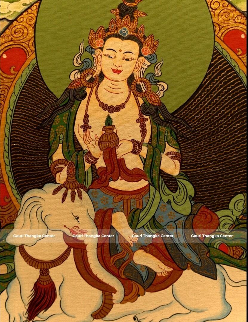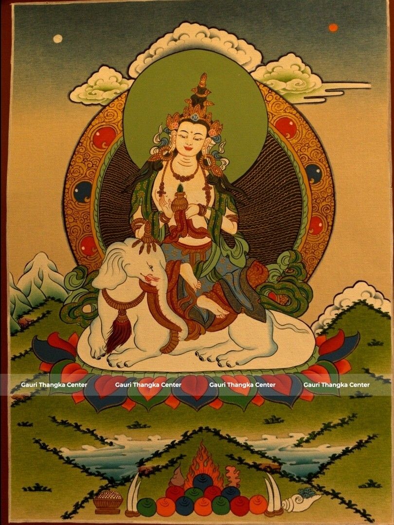 This Thangka portrays Samantabhadra in a calm and balanced composition, seated gracefully on his sacred elephant. The traditional style, soft natural colors, and symbolic elements create a peaceful and culturally resonant artwork, especially meaningful for devotees and collectors across East Asia.
