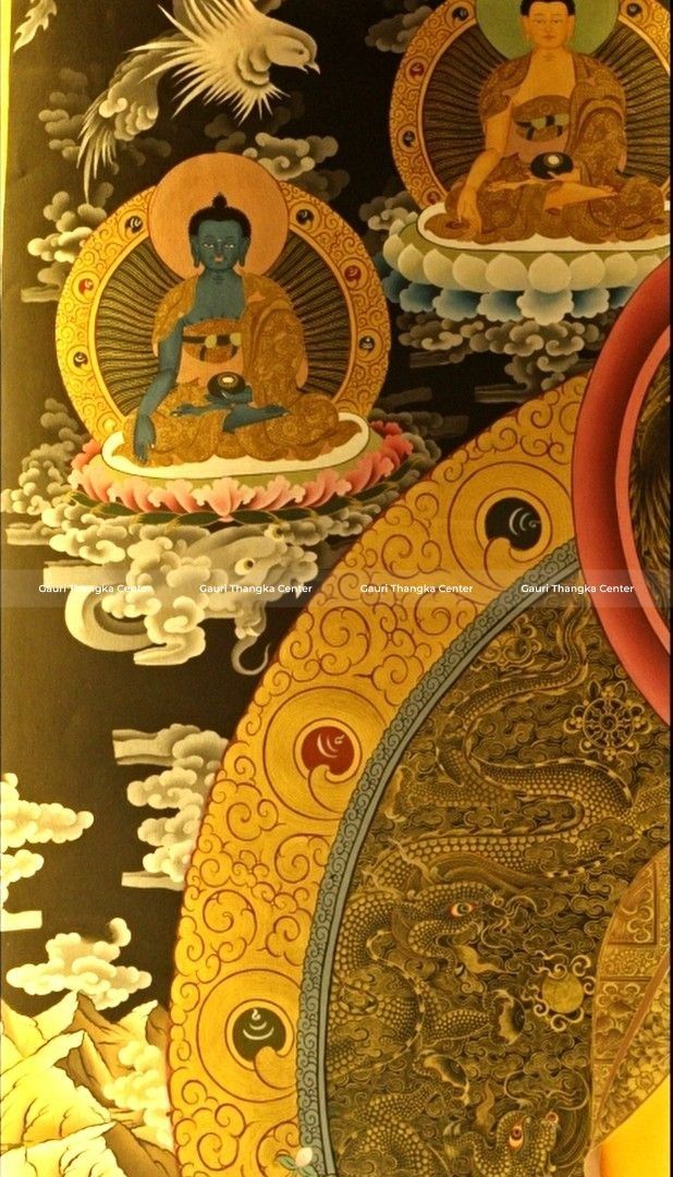 This hand-painted Thangka portrays Buddha in a calm meditative state, enriched with 24K gold detailing and natural pigments that enhance its depth and sacred presence.