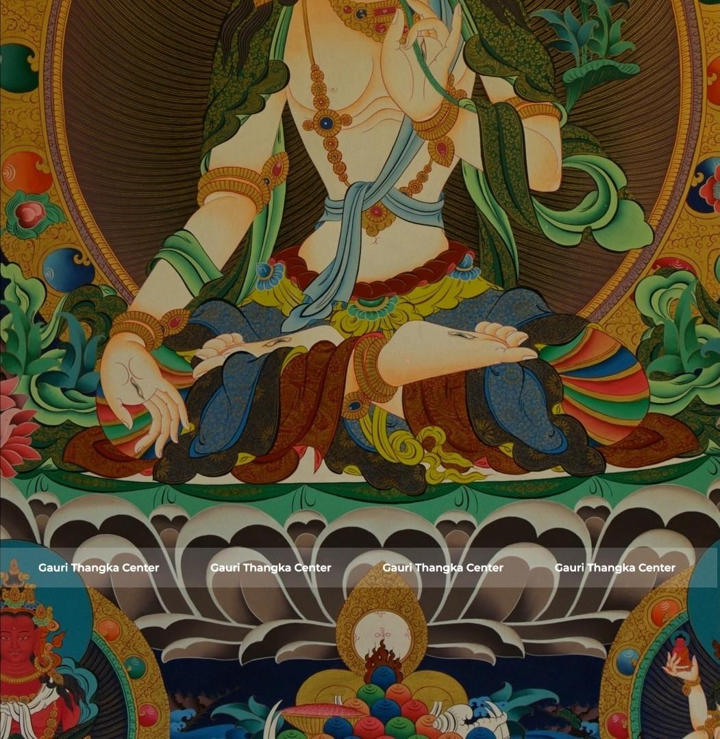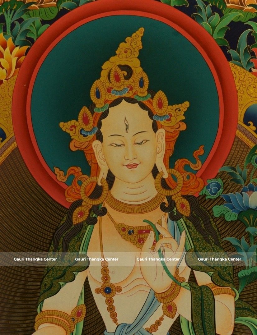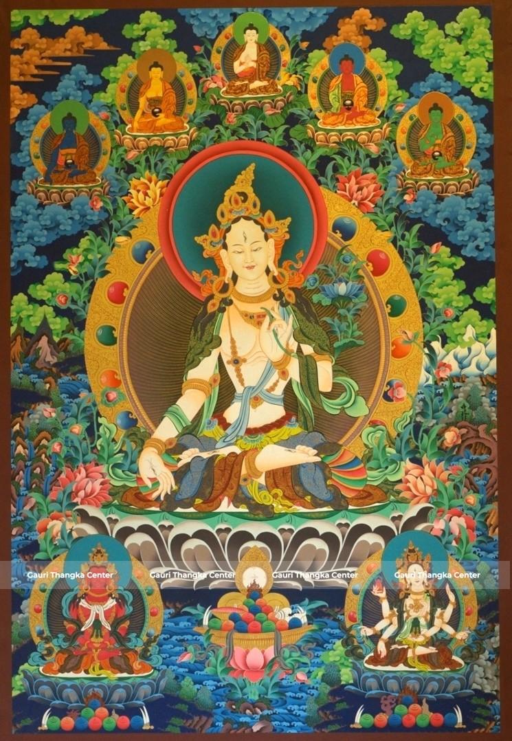 This masterpiece-level White Tara Thangka presents the deity in a serene and graceful seated posture, radiating calmness, compassion, and divine presence. Surrounded by rich natural elements and celestial figures, the composition reflects harmony, purity, and spiritual abundance.